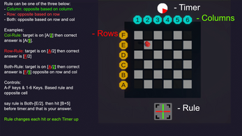 The game is about a Grid board. showing a fake target on one of the cells. However that is not the real target. Player must hit the right row-column intersection before timer is up. Player can know real target postion by using the rule on bottom.